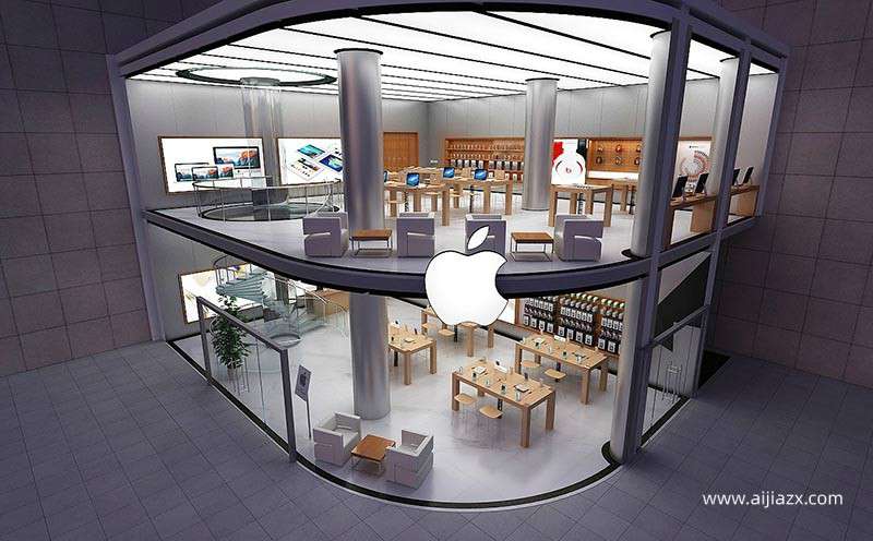 2,蘋果手機(jī)店裝修功能。方正的外觀是現(xiàn)代建筑設(shè)計(jì)的一個(gè)特征。全景落地玻璃貫穿兩層,使立面簡(jiǎn)潔大氣。